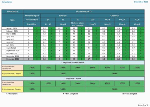 The tables show monthly monitoring results for 2025 across microbiological, physical and chemical parameters including faecal coliform, pH, suspended solids, electrical conductivity, COD, ammonia, nitrate/nitrite and phosphate. Each result is evaluated against regulatory limits, with “C” indicating compliant results. Across all parameters and months shown, both plants achieved 100% compliance, demonstrating sustained treatment performance long after commissioning.